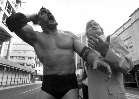 | In a photo taken by legendary Florida wrestling photographer Bill Otten, here I am giving The Missing Link a tour of downtown Orlando. I had a great time managing 'The Link' in Florida, and we eventually ended up in Texas together. | ||||||||||||||||||||||||||||||||||||||