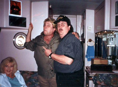 | Here I am aboard the “Jones Boys” tour bus, the band of my country music idol George “The Possum” Jones. George’s lead guitar player and backup singer, Ron Gaddis, is doing his best Paul Bearer imitation, as he shows me that my photo hangs on their bus as they travel all over the country. The blond lady on the left is The Possum’s personal hairdresser. | ||||||||||||||||||||||||||||||||||||||